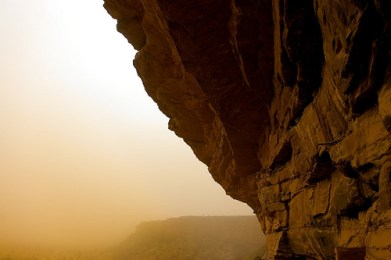 Atardece en Teli. Enrojecen los muros de barro, las antiguas casas de los pigmeos y la falaise de la que cuelgan. Hasta el polvo que se levanta al caminar es rojo.