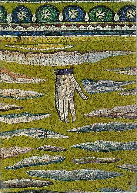 La foto que precede estas líneas es una postal que lleva mucho tiempo acompañándome. Muestra una mano surgiendo de un cielo de teselas doradas con nubes en forma de pan. Es majestuosa, pero también algo ruda. Representa la Dextera Dei, la mano derecha de Dios, uno de los símbolos más poderosos del arte medieval.