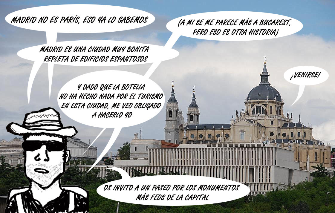 Madrid posee grandes y variados truños arquitectónicos, pero vamos a empezar este recorrido del horror por el mayor de todos ellos. No, no me refiero a las cuatro torres desproporcionadas de la Castellana, tampoco a las torcidas, las KIO, ni al obelisco dorado de Calatrava que las acompaña. En esta ocasión vamos a hablar de un edificio que (al menos a mí) me da mucha más pena: la malograda catedral de la Villa y Corte. Sed sinceros: ¿habéis visto alguna vez un templo más feo en vuestra vida? Seguro que no.