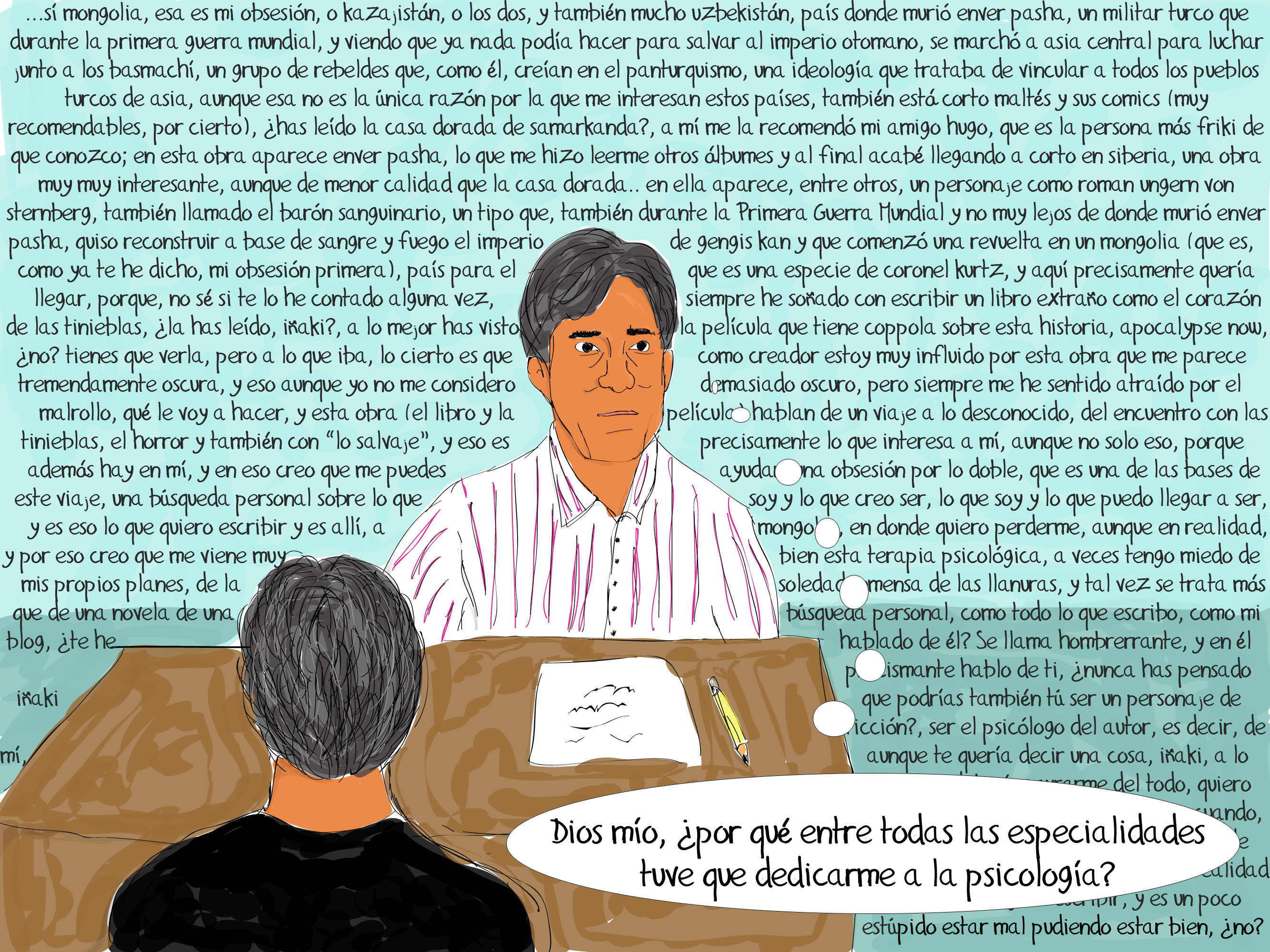 El psicoterapeuta en estado de trance que he retratado sobre estas líneas se llama Iñaki Vázquez. Es también psiquiatra, aunque en mi caso, afortunadamente, no han sido necesarios los ansiolíticos.