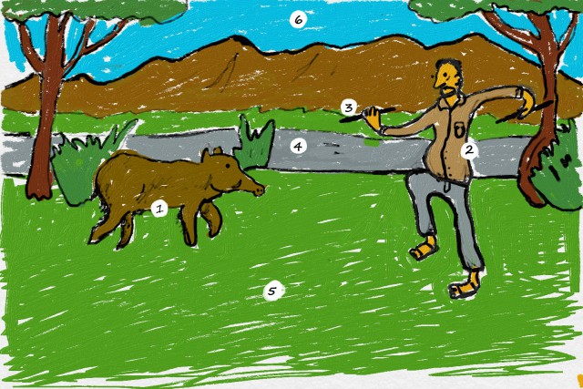 Sin embargo, antes de desandar el desierto de vuelta y volver a casa a ver la tele en el salón (os recuerdo que me encontraba rodeado de un inmenso bosque que debería tener lugares increíbles por los que pasear), ocurrió algo que al menos me hizo reír. Un enorme jabalí apareció entre la espesura y, aunque no tenía intención de hacernos daño, todos ellos entraron en psicosis, así que me vi obligado a terminar mi comida apresuradamente y ayudarles a levantar el campamento. Issa, el padre de familia, tuvo que hacer frente al peligro como pudo. Con los pinchos con los que se hace el kebab, el culo en pompa y su barriga más que prominente, comenzó a hacer aspavientos y unos ruidos absurdos para asustar al jabalí que provocaron en el resto un ataque de risa. El salvaje animal, por cierto, no se movió ni un centímetro. Ah, los turcomanos, ese pueblo de aguerridos nómadas que dirigieron inmensos imperios. ¡Quién los ha visto y quien los ve!