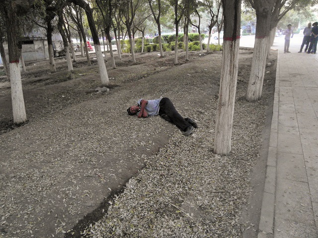 Otro hombre desmayado en la calle. Este no está precisamente trabajando como un chino, ¿eh?.